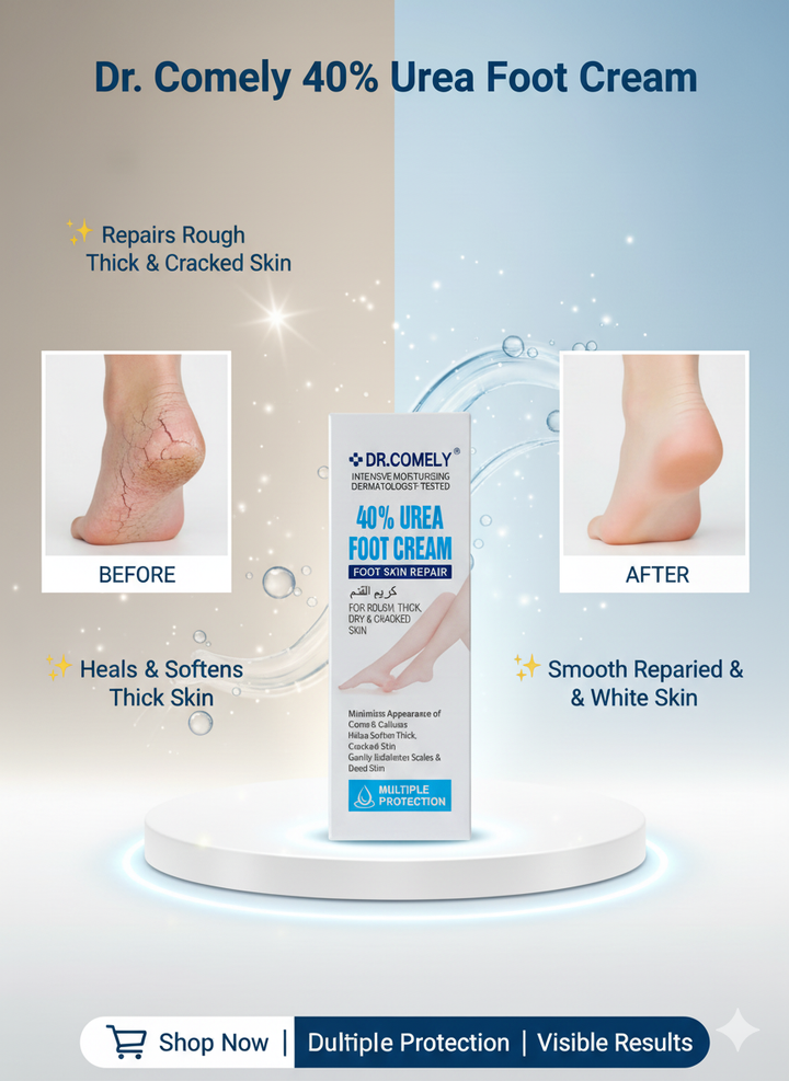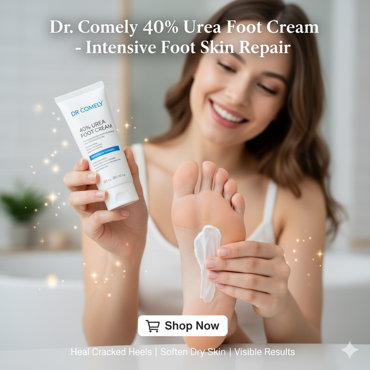 Finally, a solution for dry, cracked, and rough feet! Dr. Comely 40% Urea Foot Cream is a high-potency formula designed to provide intensive care for your feet. Our dermatologist-tested cream is packed with 40% Urea, an ingredient trusted to deeply moisturize, soften thick skin, and repair tough cracks. Say goodbye to pain and discomfort and hello to smooth, healthy-looking feet.