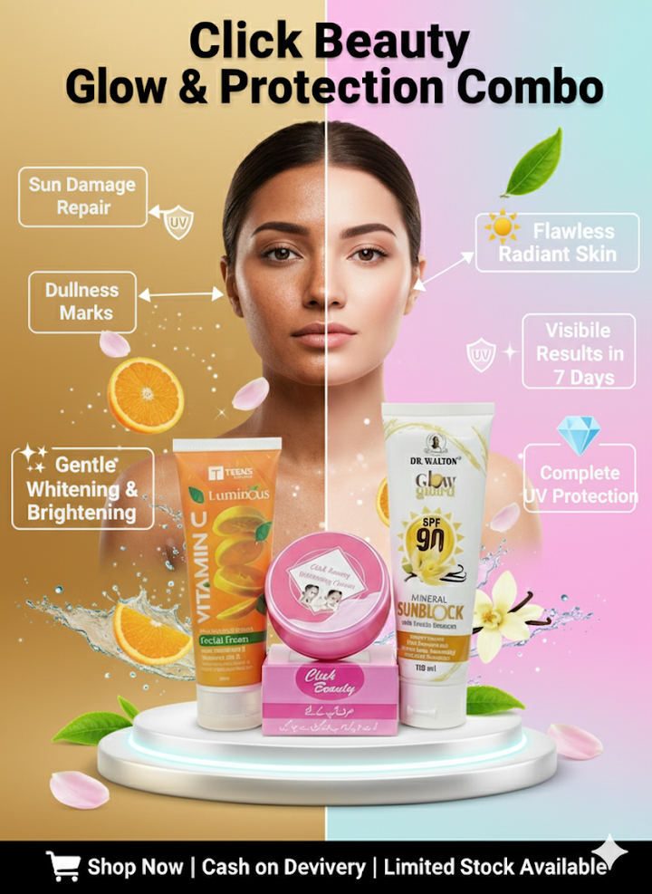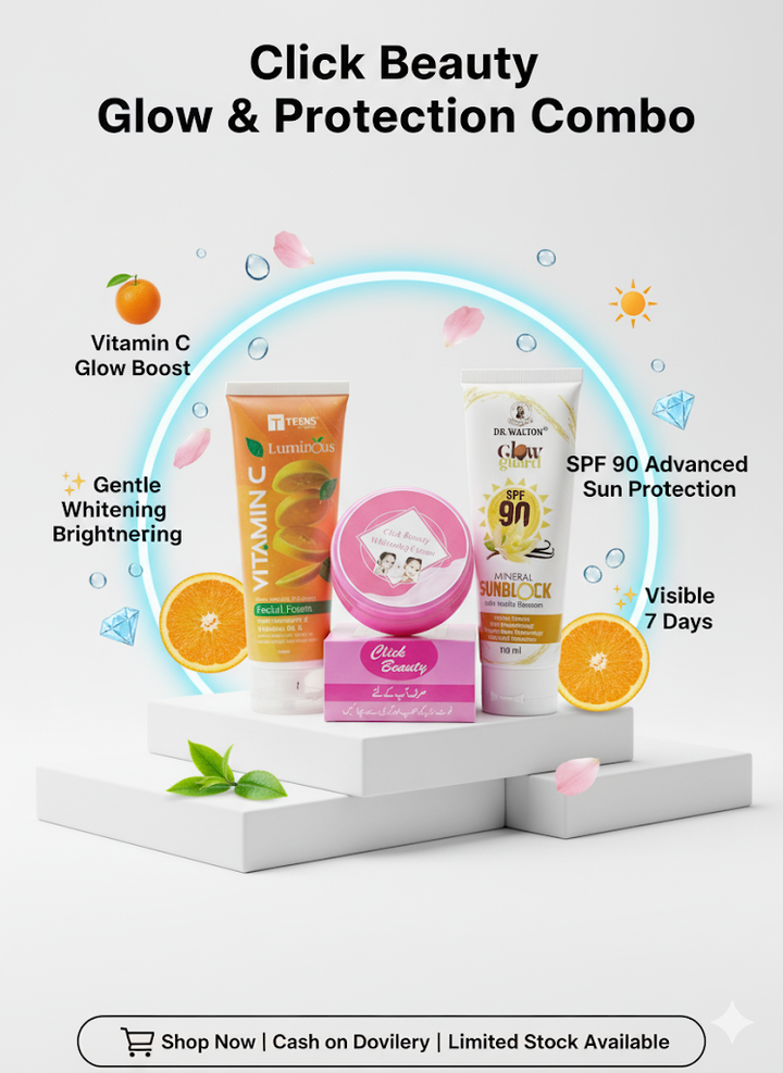 Achieve your brightest, most protected skin with the Click Beauty Glow & Protection Combo! This powerful 3-in-1 system is your complete solution for a radiant and flawless complexion. It combines the deep-cleansing power of Vitamin C Facial Foam, the brightening effects of Click Beauty Whitening Cream, and the ultimate sun protection of Dr. Walton Glow Guard Sunblock SPF 90. Say hello to a visible glow and goodbye to dullness and sun damage.